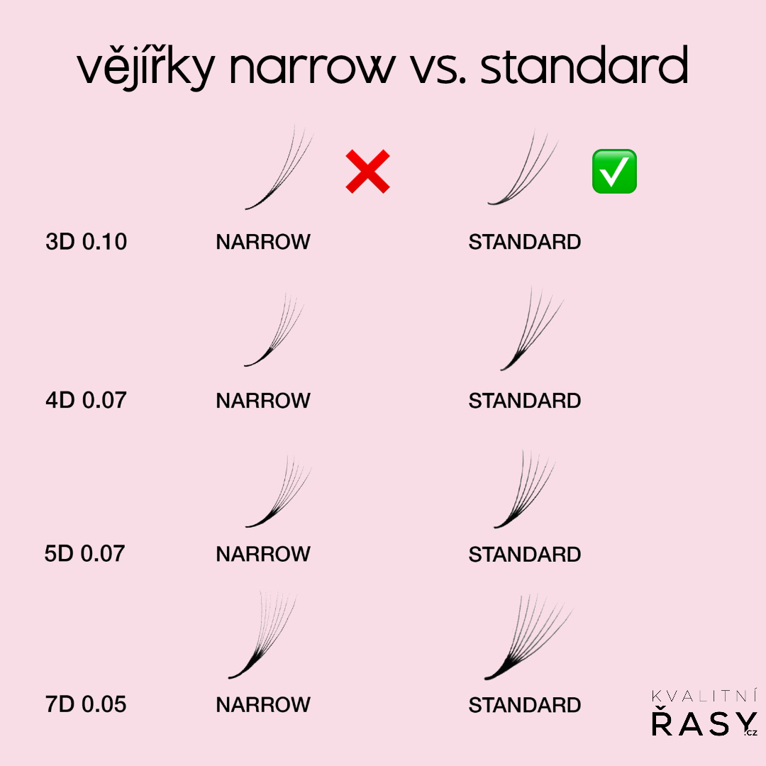 Hotové vějířky nové generace! Dokonale symetrické vějířky s úzkou nožkou, která perfektně přilne k vlastní řase. Vějířky typu "standard" jsou více otevřené než typ "narrow" - jsou tedy vhodné především pro klientky s řídkými řasami.