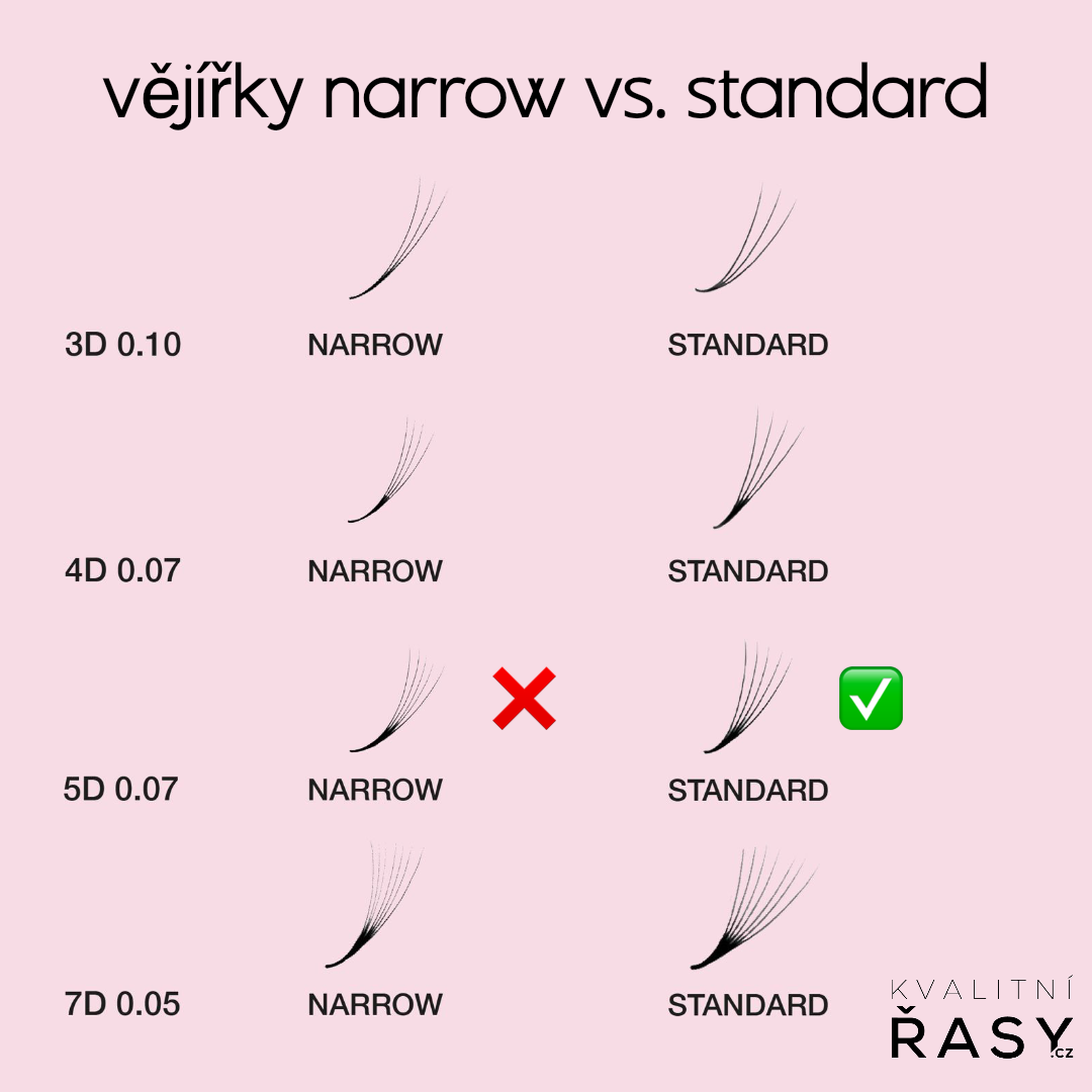 Hotové vějířky nové generace! Dokonale symetrické vějířky s úzkou nožkou, která perfektně přilne k vlastní řase. Vějířky typu "standard" jsou více otevřené než typ "narrow" - jsou tedy vhodné především pro klientky s řídkými řasami.